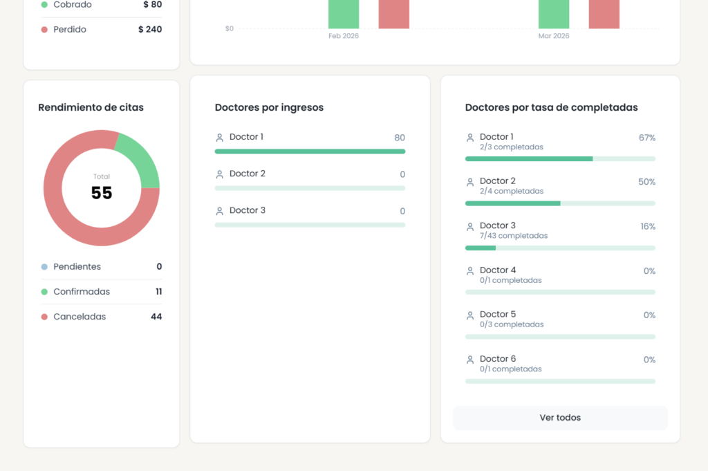 Obtenga datos detallados sobre el flujo de pacientes, la productividad por médico y el rendimiento del centro al instante.